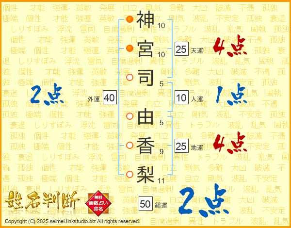神(10画)宮(10画)司(5画) 由(5画)香(9画)梨(11画)