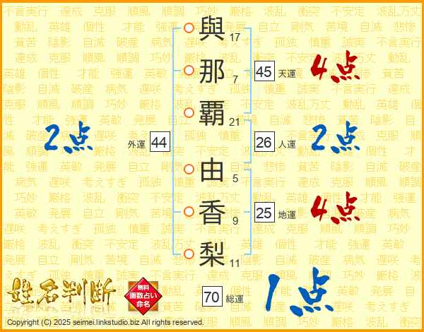 與(17画)那(7画)覇(21画) 由(5画)香(9画)梨(11画)