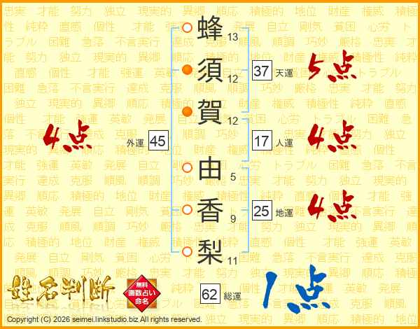 蜂(13画)須(12画)賀(12画) 由(5画)香(9画)梨(11画)