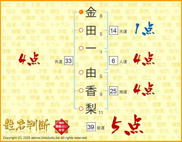 金(8画)田(5画)一(1画) 由(5画)香(9画)梨(11画)