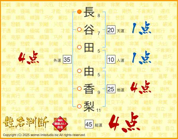 長(8画)谷(7画)田(5画) 由(5画)香(9画)梨(11画)