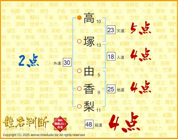 高(10画)塚(13画) 由(5画)香(9画)梨(11画)