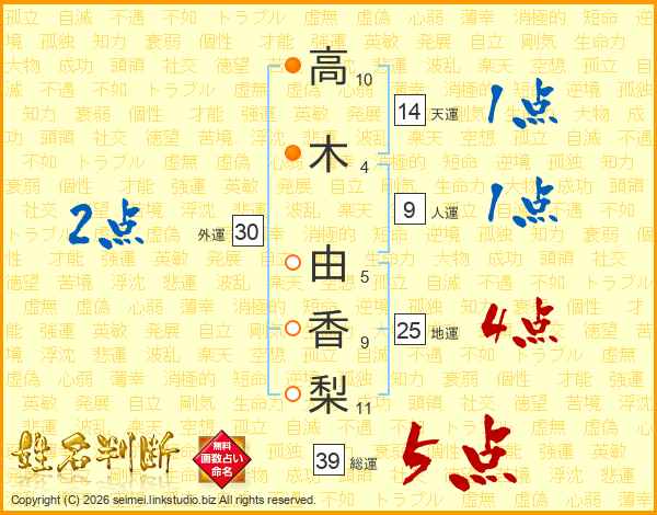 高(10画)木(4画) 由(5画)香(9画)梨(11画)