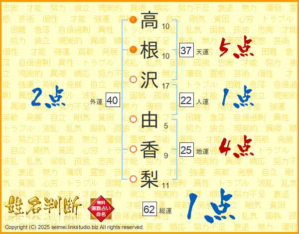高(10画)根(10画)沢(17画) 由(5画)香(9画)梨(11画)