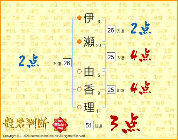 伊(6画)瀬(20画) 由(5画)香(9画)理(11画)