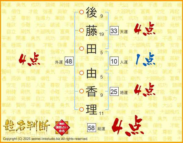 後(9画)藤(19画)田(5画) 由(5画)香(9画)理(11画)