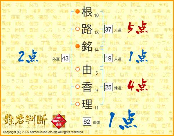 根(10画)路(13画)銘(14画) 由(5画)香(9画)理(11画)