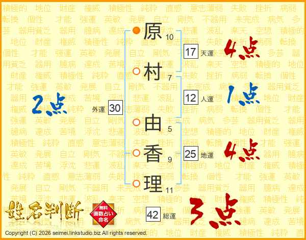 原(10画)村(7画) 由(5画)香(9画)理(11画)