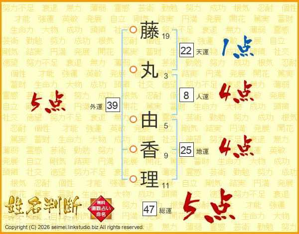 藤(19画)丸(3画) 由(5画)香(9画)理(11画)