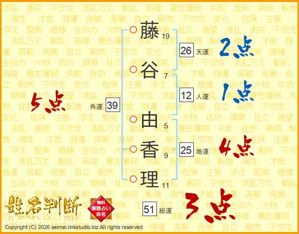 藤(19画)谷(7画) 由(5画)香(9画)理(11画)