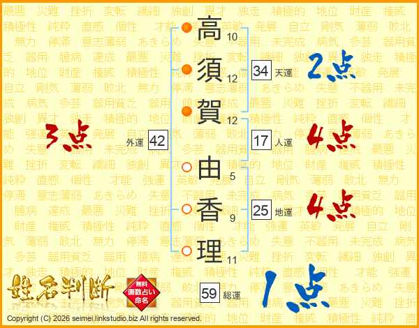 高(10画)須(12画)賀(12画) 由(5画)香(9画)理(11画)