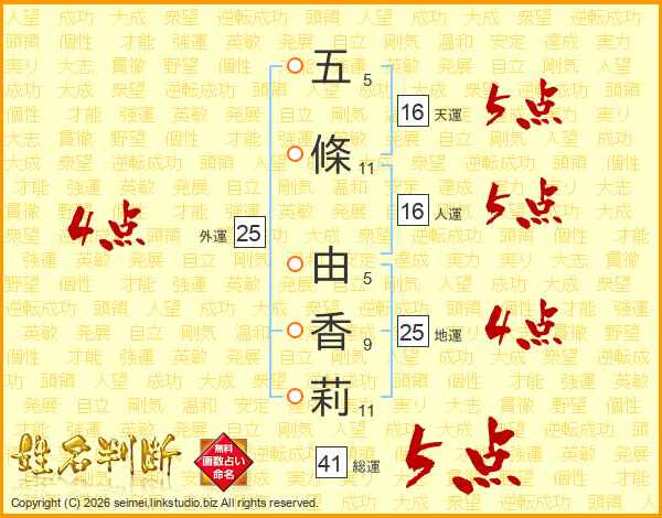 五(5画)條(11画) 由(5画)香(9画)莉(11画)