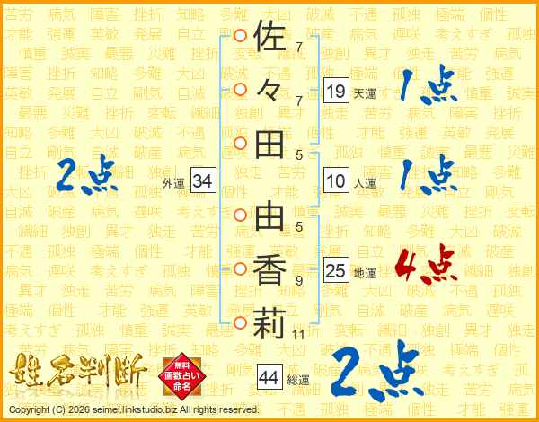 佐(7画)々(7画)田(5画) 由(5画)香(9画)莉(11画)