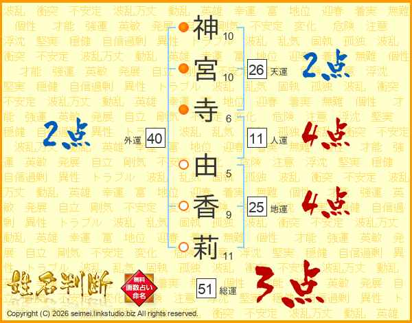 神(10画)宮(10画)寺(6画) 由(5画)香(9画)莉(11画)