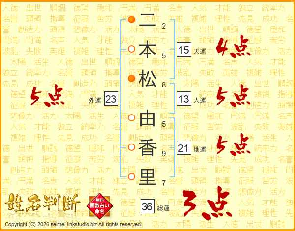 二(2画)本(5画)松(8画) 由(5画)香(9画)里(7画)