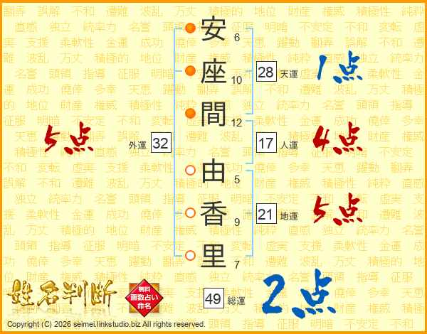 安(6画)座(10画)間(12画) 由(5画)香(9画)里(7画)