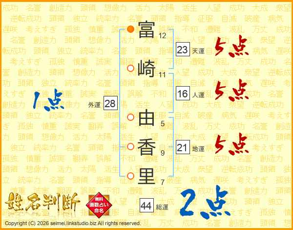 富(12画)崎(11画) 由(5画)香(9画)里(7画)