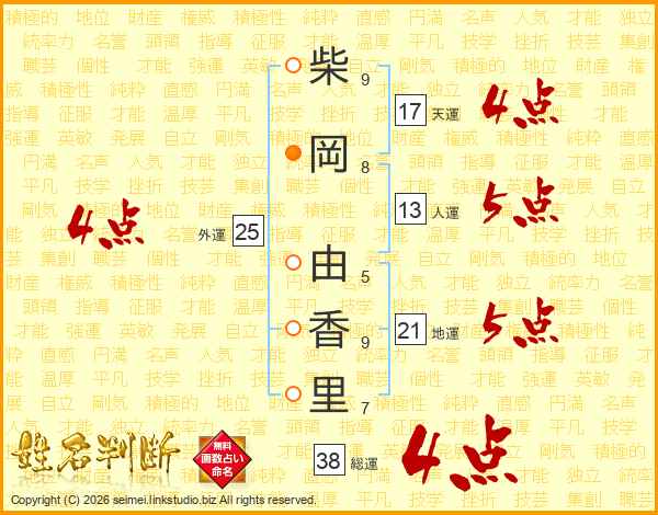柴(9画)岡(8画) 由(5画)香(9画)里(7画)