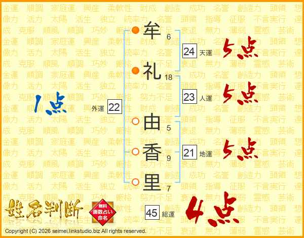 牟(6画)礼(18画) 由(5画)香(9画)里(7画)