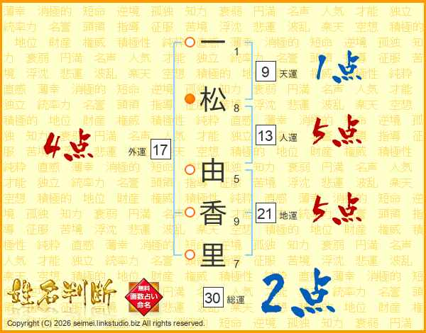 一(1画)松(8画) 由(5画)香(9画)里(7画)