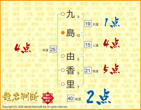 九(9画)島(10画) 由(5画)香(9画)里(7画)