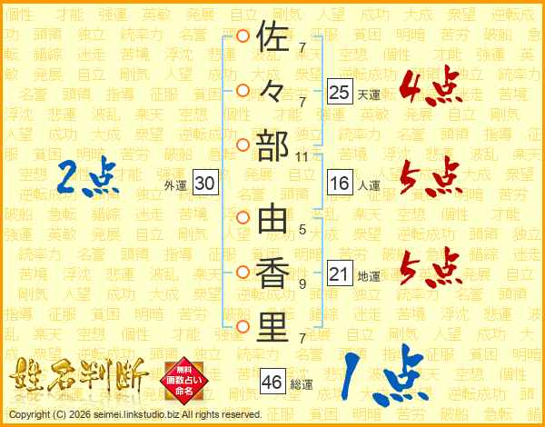 佐(7画)々(7画)部(11画) 由(5画)香(9画)里(7画)