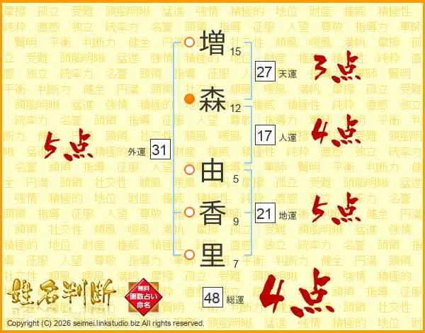 増(15画)森(12画) 由(5画)香(9画)里(7画)
