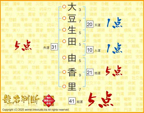 大(3画)豆(7画)生(5画)田(5画) 由(5画)香(9画)里(7画)