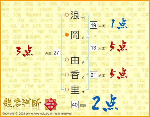 浪(11画)岡(8画) 由(5画)香(9画)里(7画)