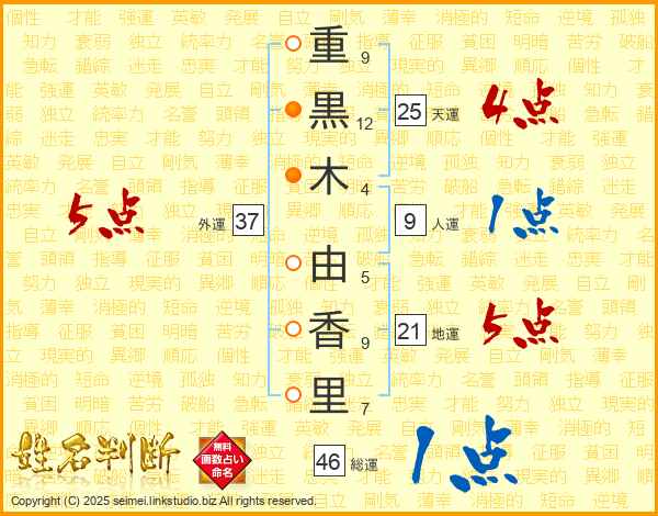 重(9画)黒(12画)木(4画) 由(5画)香(9画)里(7画)