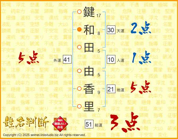 鍵(17画)和(8画)田(5画) 由(5画)香(9画)里(7画)
