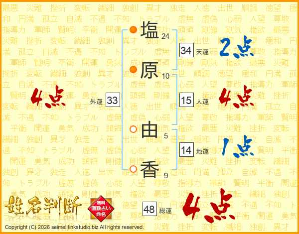 塩(24画)原(10画) 由(5画)香(9画)