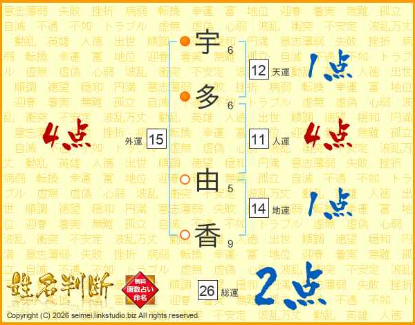 生活面を象徴する運勢です。外部から受ける影響力を表し、結婚運、家庭運や職場、環境への順応性を表します。総運から人運を引いた画数。姓や名が1文字の場合を除く。