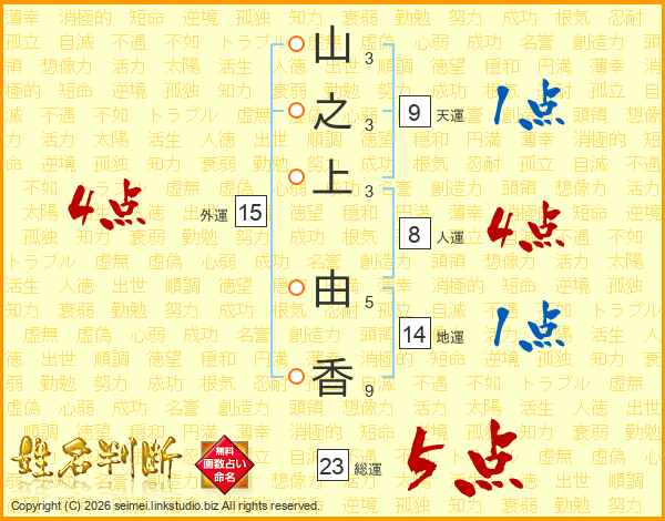 山(3画)之(3画)上(3画) 由(5画)香(9画)