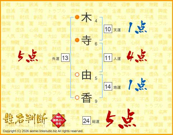 木(4画)寺(6画) 由(5画)香(9画)