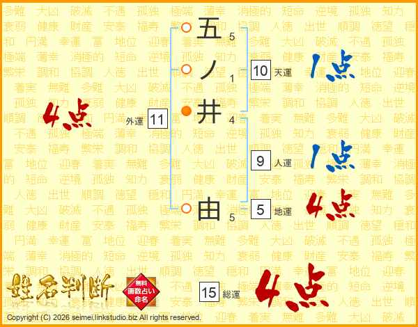 生活面を象徴する運勢です。外部から受ける影響力を表し、結婚運、家庭運や職場、環境への順応性を表します。総運から人運を引いた画数。姓や名が1文字の場合を除く。
