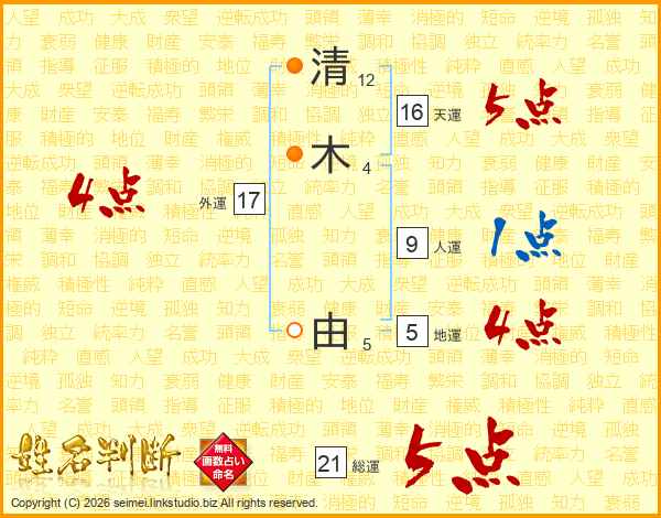 清木由さんの総運は21画の5点!