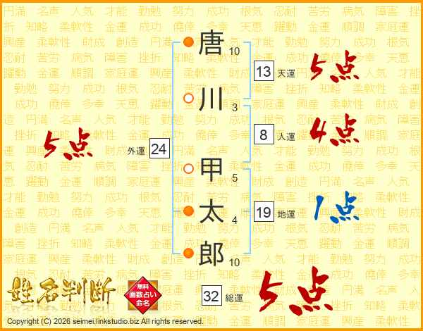 唐川甲太郎さんの総運は32画の5点!