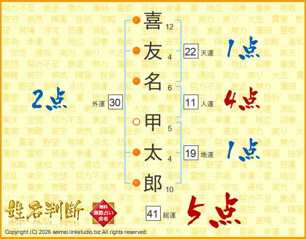 喜(12画)友(4画)名(6画) 甲(5画)太(4画)郎(10画)