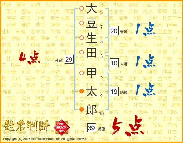 大(3画)豆(7画)生(5画)田(5画) 甲(5画)太(4画)郎(10画)