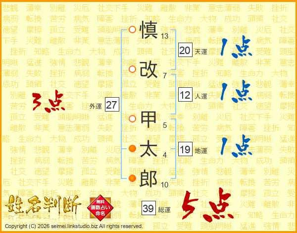 慎(13画)改(7画) 甲(5画)太(4画)郎(10画)