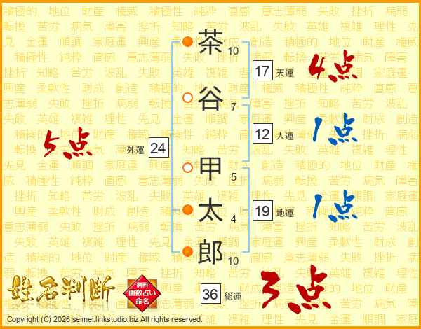 茶(10画)谷(7画) 甲(5画)太(4画)郎(10画)