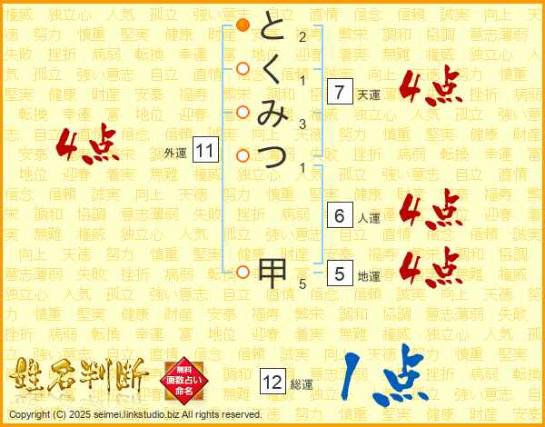 生活面を象徴する運勢です。外部から受ける影響力を表し、結婚運、家庭運や職場、環境への順応性を表します。総運から人運を引いた画数。姓や名が1文字の場合を除く。