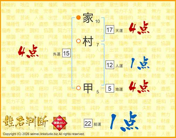 家村甲さんの総運は22画の1点!