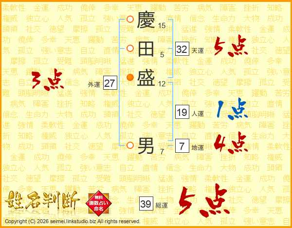生活面を象徴する運勢です。外部から受ける影響力を表し、結婚運、家庭運や職場、環境への順応性を表します。総運から人運を引いた画数。姓や名が1文字の場合を除く。