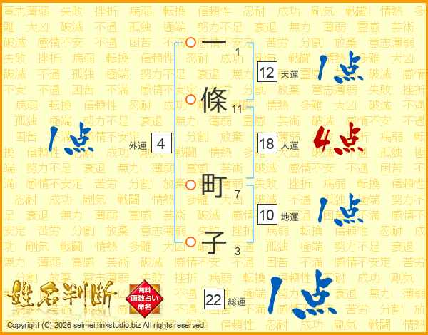 生活面を象徴する運勢です。外部から受ける影響力を表し、結婚運、家庭運や職場、環境への順応性を表します。総運から人運を引いた画数。姓や名が1文字の場合を除く。