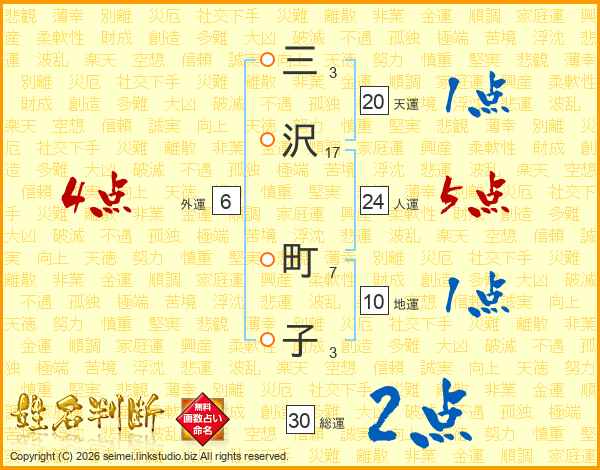 生活面を象徴する運勢です。外部から受ける影響力を表し、結婚運、家庭運や職場、環境への順応性を表します。総運から人運を引いた画数。姓や名が1文字の場合を除く。