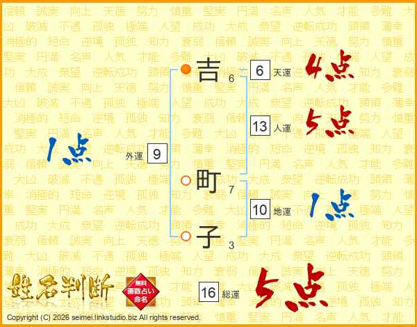 あなたの人生を表す1番重要な運勢です。生涯を通じて影響する総合運となり、主に50歳以降の晩年期に影響を及ぼします。苗字と名前の合計画数。
