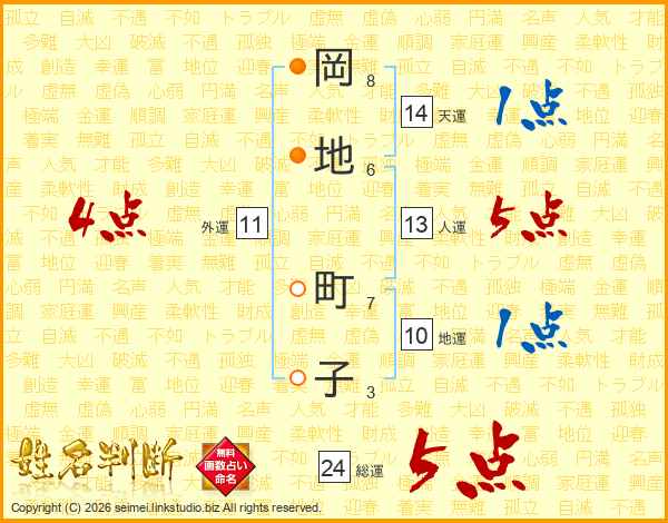 生活面を象徴する運勢です。外部から受ける影響力を表し、結婚運、家庭運や職場、環境への順応性を表します。総運から人運を引いた画数。姓や名が1文字の場合を除く。