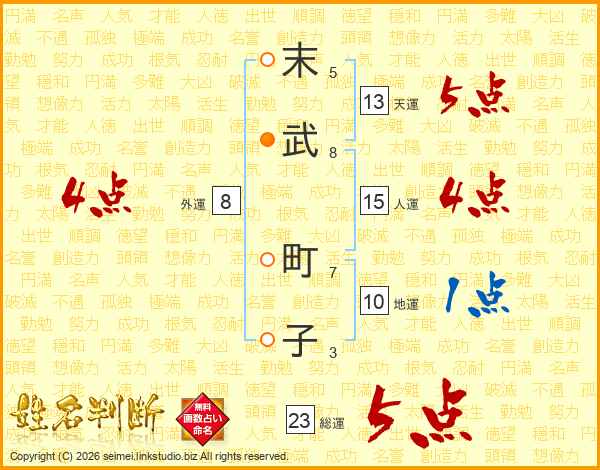 末(5画)武(8画) 町(7画)子(3画)